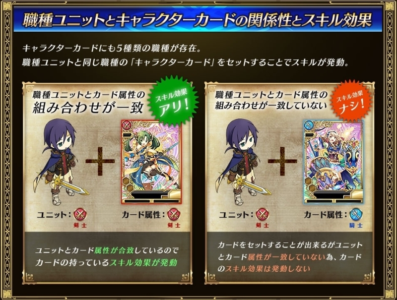 游戏中的人物将以2.5头身的比例呈现,游戏中的每名单位可以装备三张人物卡片;同时单位与人物卡片分有还有剑士、骑士、魔术师、弓箭手以及治疗者五大职业,当单位与身上装备的人物卡片属性一致的时候,就能发动卡片上所持有的各种技能效果,玩家可以活用这点来进行编组装备,打造高战略性的强力部队。