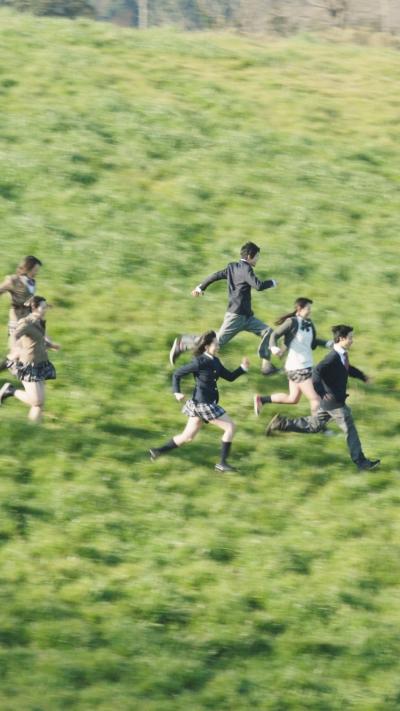 草原を走る学生達のシーン。